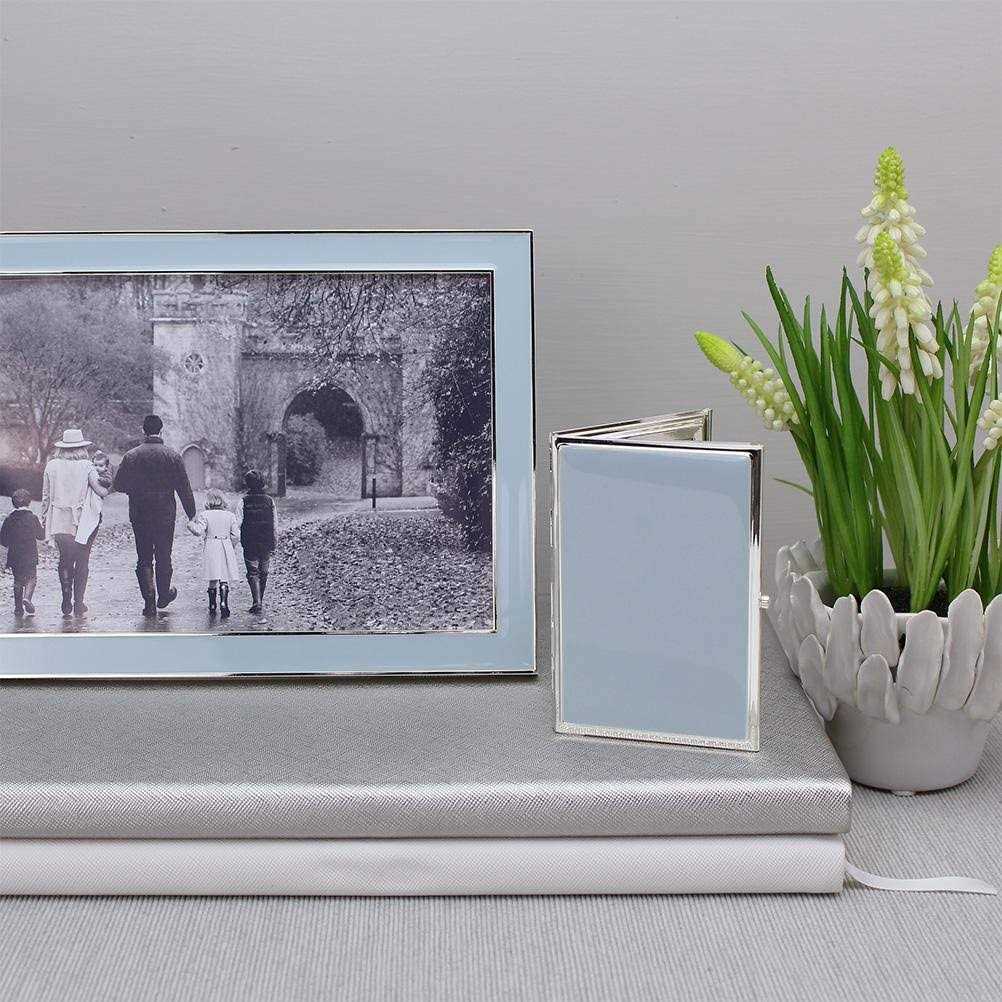 This exclusive Addison Ross designed powder blue enamel and silver 15mm frame sets off both colour and black and white photos beautifully. Group them to make an impressive statement. Silver plate with powder blue enamel, backed with light grey luxury velvet. Keep dry, clean with a duster.