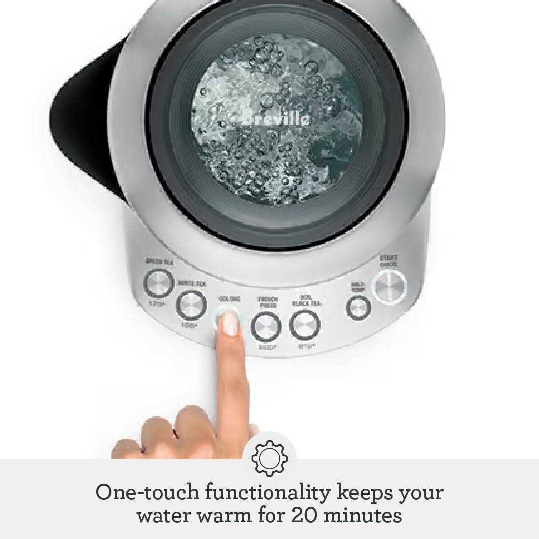 Breville BKE820XL IQ Kettle Brushed Stainless Steel 7.5 Cups – Get the temperature Ideal for Coffee or your favorite tea with the touch of a button. Five preset brewing temperatures include green tea white tea oolong tea French press and boil and black tea. The ‘hold temperature’ feature keeps water at the selected temperature for 20 minutes. A water-level indicator on Each side allows easy viewing. Features safety shut-off so it won’t boil dry and removable scale filter. Brushed stainless steel construction is sturdy and looks modern. Large 60-oz. Capacity. For use with water only.