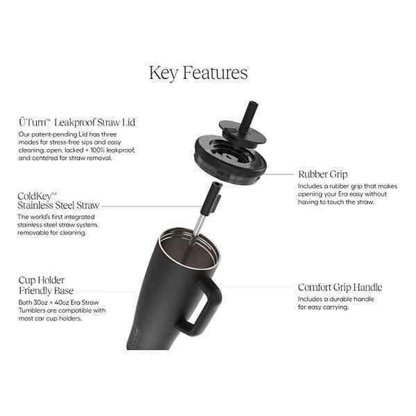 A new Era of straw tumbler is here. Our Era tumbler is totally leakproof, and made for stress free sips on the go. It has our fully leakproof Ü-Turn lid that works for both cold and carbonated beverages, ColdKey metal straw for minimizing the amount of plastic sitting in your water, BevGuard technology to keep ice for 24+ hours, and a cup-holder friendly base so you can enjoy 30oz of your favorite beverage, free of leaks and spills throughout your daily journey.Era Tumblers are 100% leakproof with cold beverages and carbonated beverages with ice when in the locked position. Not recommended to be used in the locked position with hot beverages.