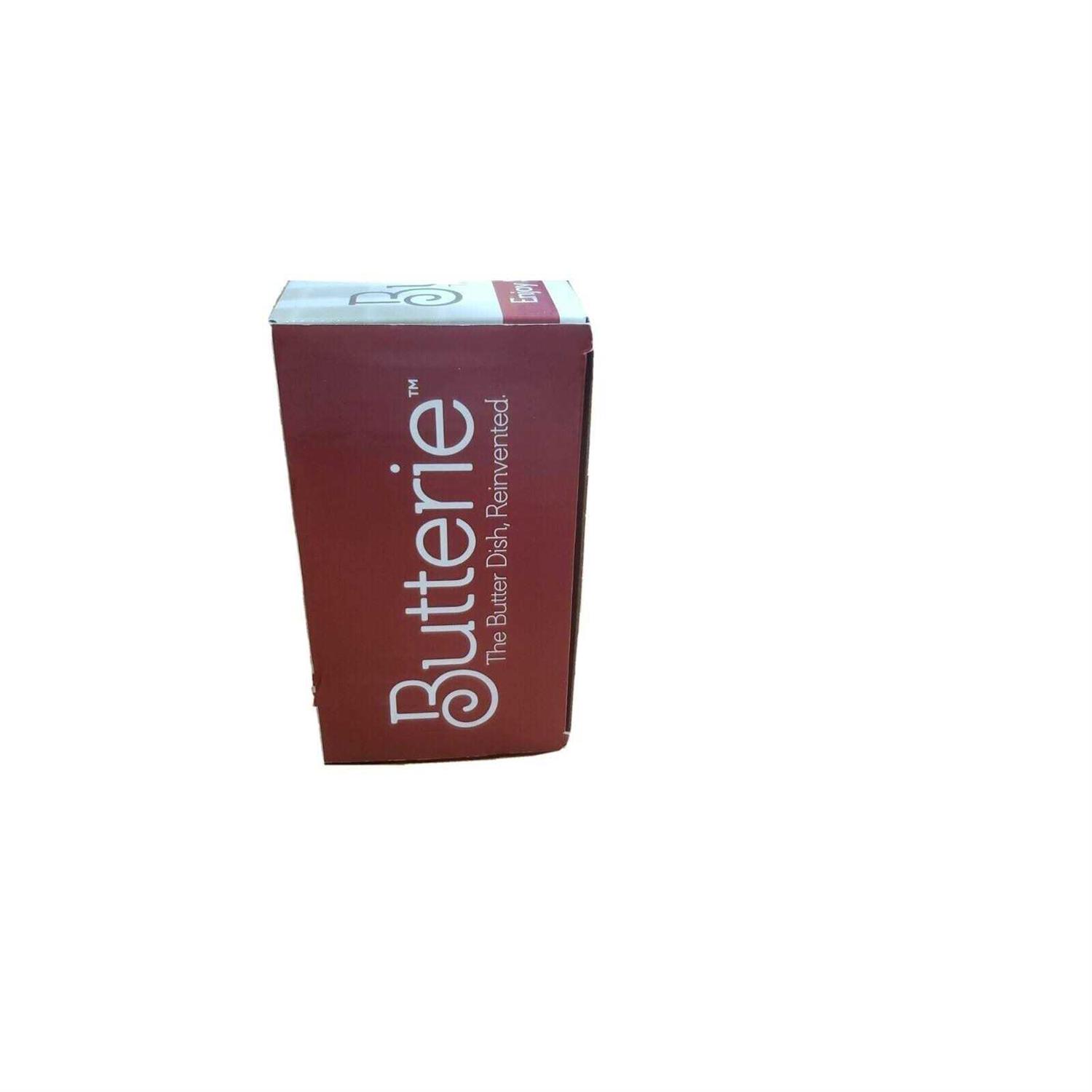 Keep butter spreadable and soft whenever you need it with this innovative butter dish. Butterie features a non-slip, flip-top lid and sits on the counter so you can enjoy mess-free butter anytime. A hidden back wall lets you scrape the spreader clean, and easy-grip handles let you tote it from counter to table. Includes butter dish and matching spreader. Holds two sticks of butter. Dimensions: 9″ W x 5.5″ H x 3″ D.