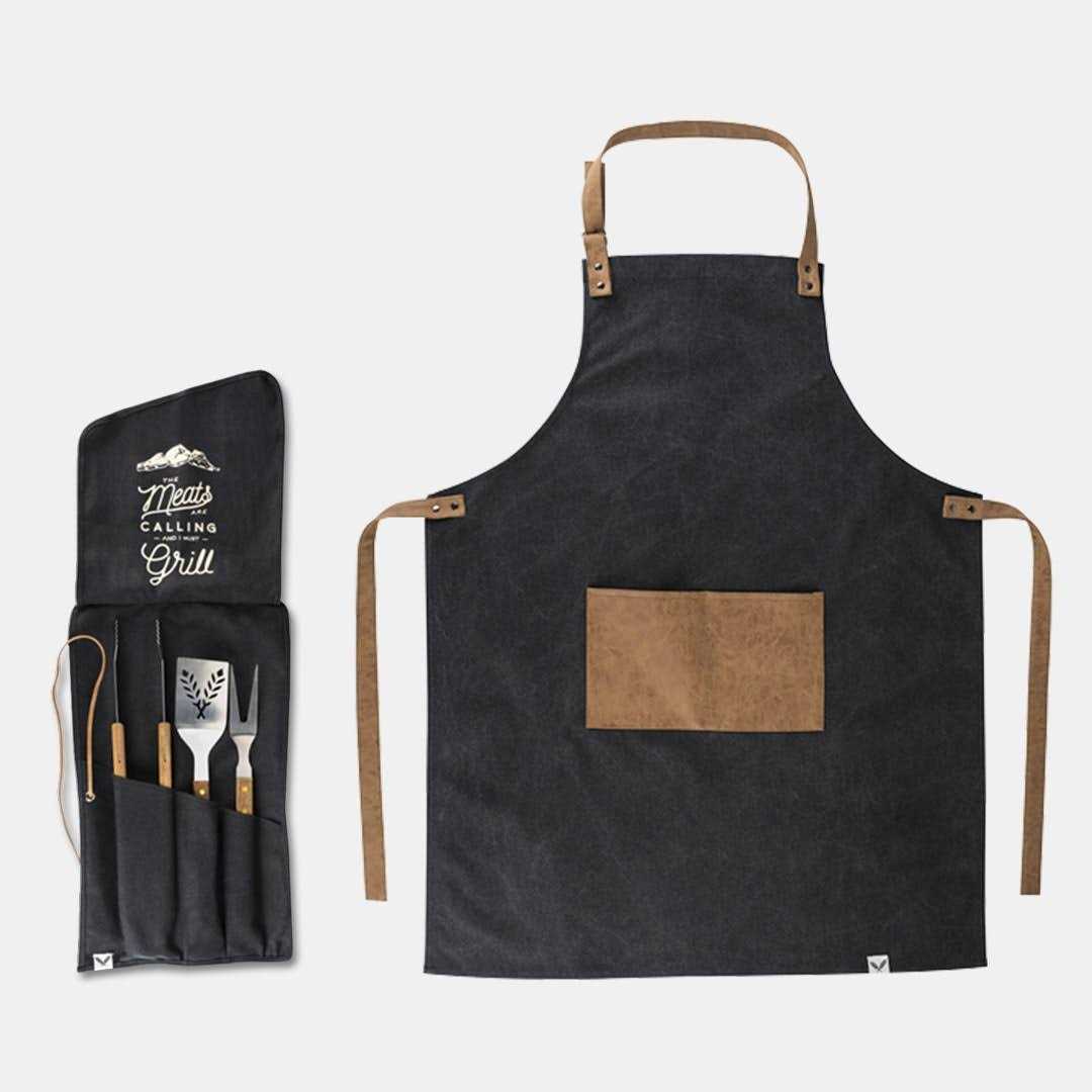 Barbecue Tool Sets by Foster & Rye. Details:Foster & Rye! That stands for Food is Ready–and you’ll be one kissable cook in this grilling apron. Two sturdy front pockets hold everything you need to get cooking: utensils, tools, and maybe a pre-BBQ beverage or two. Made of durable canvas with faux leather straps and pockets Features a woven label with Foster & Rye cross feather logo Adjustable neck strap Two front pockets hold tools, utensils or beverages Measures 35″L x 26.