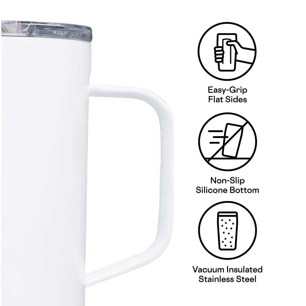 The “morning person” of our Drinkware lineup, Coffee Mug makes every day something to celebrate. Whether you’re caffeinating with a hot cup of coffee or cozying up with some chamomile tea, triple-insluated stainless steel keeps drinks hot for 3+ hours Ergonomic flat sides; non-slip, silicone bottom – Our patented, easy-grip sides ensure Sport Canteen stays securely in your hand. The silicone bottom is designed to prevent it from sliding and spilling Shatterproof lid – Our sip-through lid has a built-in slider to ensure your drink stays inside between sips. The detachable silicone gasket offers leak-resistance and easy cleaning All of our products are free from BPA Dishwasher Safe Keep your morning moment or afternoon pick-me-up warm for hours with our 22oz stainless steel Corkcicle Mug. With triple insulation, a non slip bottom and spill-resistant lid you can count on our mug to help you get through the day.