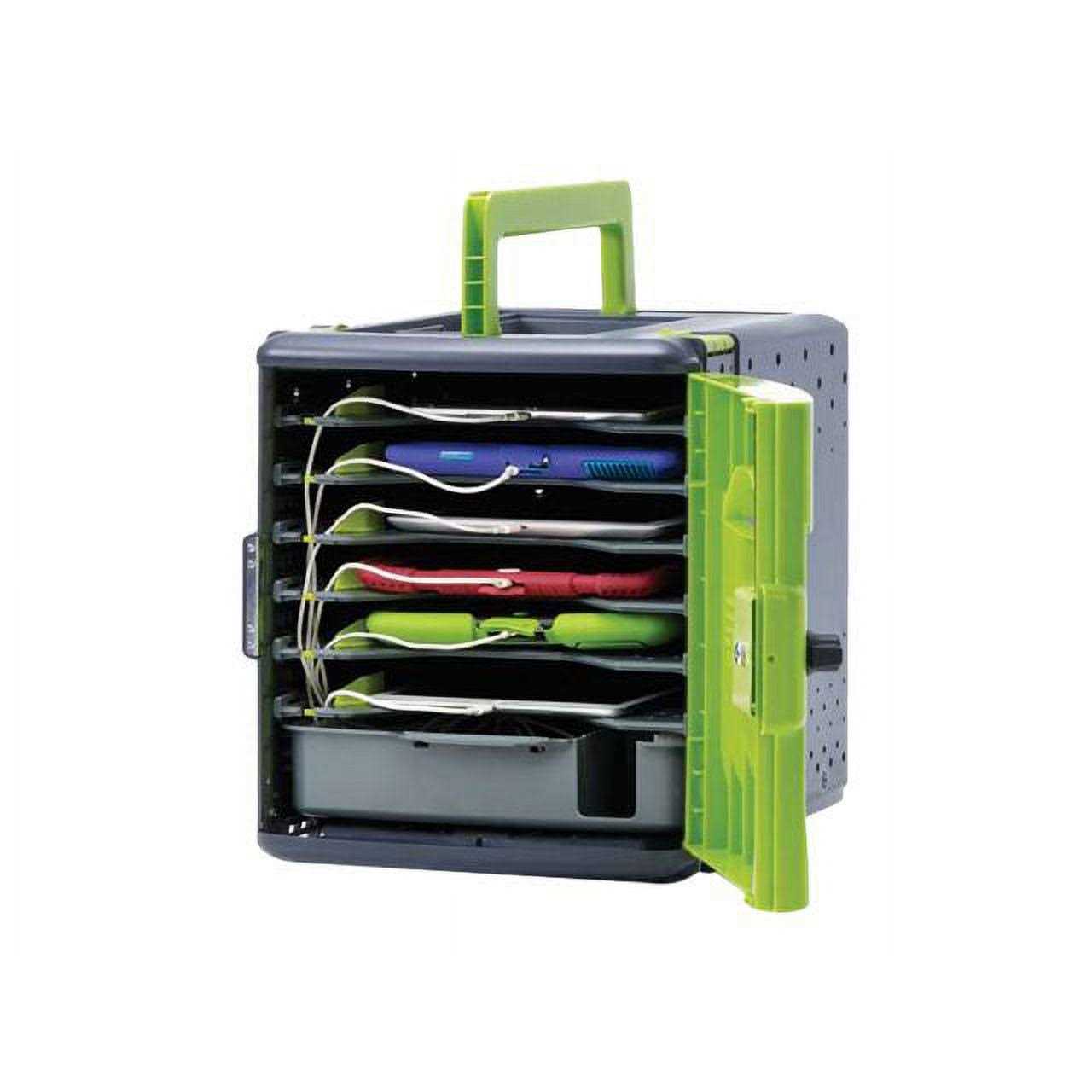 Now with updated cable management, the Tech Tub2 is even more user friendly. Developed with input from members of our Idea Lab educator advisory team, the new Tech Tub2 offers an affordable, flexible and mobile solution for charging and storing devices used in PreK-8 classrooms. The Tech Tub stores 6 iPads, Chromebooks or tablets. Store, charge and carry your devices anywhere in the school with ease. They are ideal for schools that share devices, or for 1:1 environments and they can be placed around the classroom to ease deployment bottlenecks.NeW Individual tubs can be locked together for added security. Improved Easy-access storage tray for device adapters and power strip. Holds all generations of iPads, most 11 Chromebook and other tablets. Tubs connect and break apart using clips (eases deployment bottlenecks). Adjustable shelves accommodate devices with and without cases. Internal 6 outlet power strip with surge protection. Cable hooks on the back to manage cord during transport. Two ergonomic handles on the door and back as well as a flip-up handle on the top.