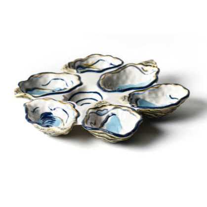 Transport your dining experience to the bay with the Oyster Half Dozen Platter. This serving piece is specially made to hold six oysters, and it includes a bowl in the middle for your favorite garnish. This platter can also be used to host chips and vegetables at summer parties. This unique design is sure to be the talk of the party! Every Coton Colors piece comes to life through the work of our design team in Tallahassee, Florida.