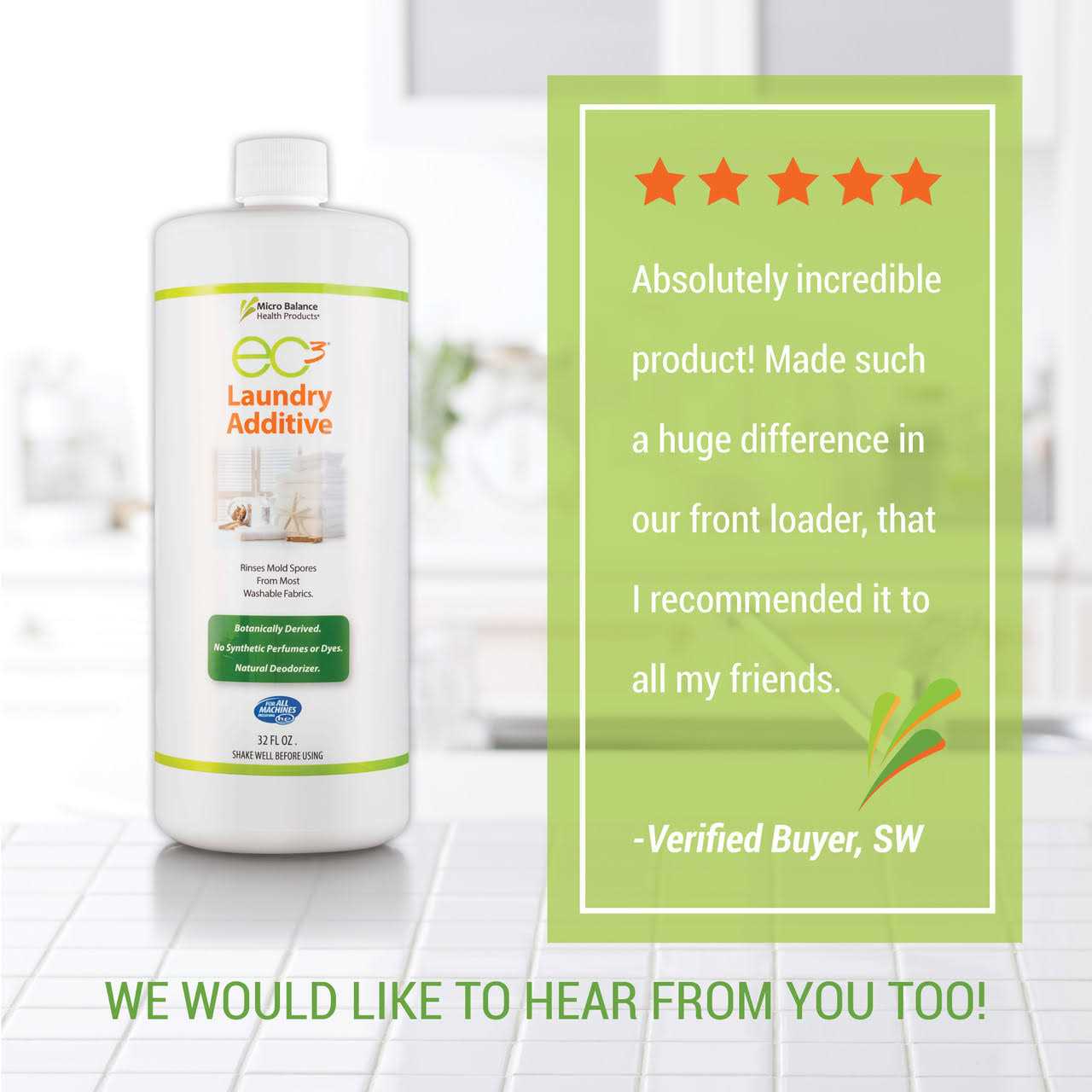 The Micro Balance EC3 Laundry Additive washes away mould spores, bacteria, and musty odours from your laundry. Use during wash cycle to remove mould and bacteria from clothing, towels, linens and athletic wear. Contains “food-grade” citrus seed extracts, tea tree oil, and natural surfactants to clean away mould.