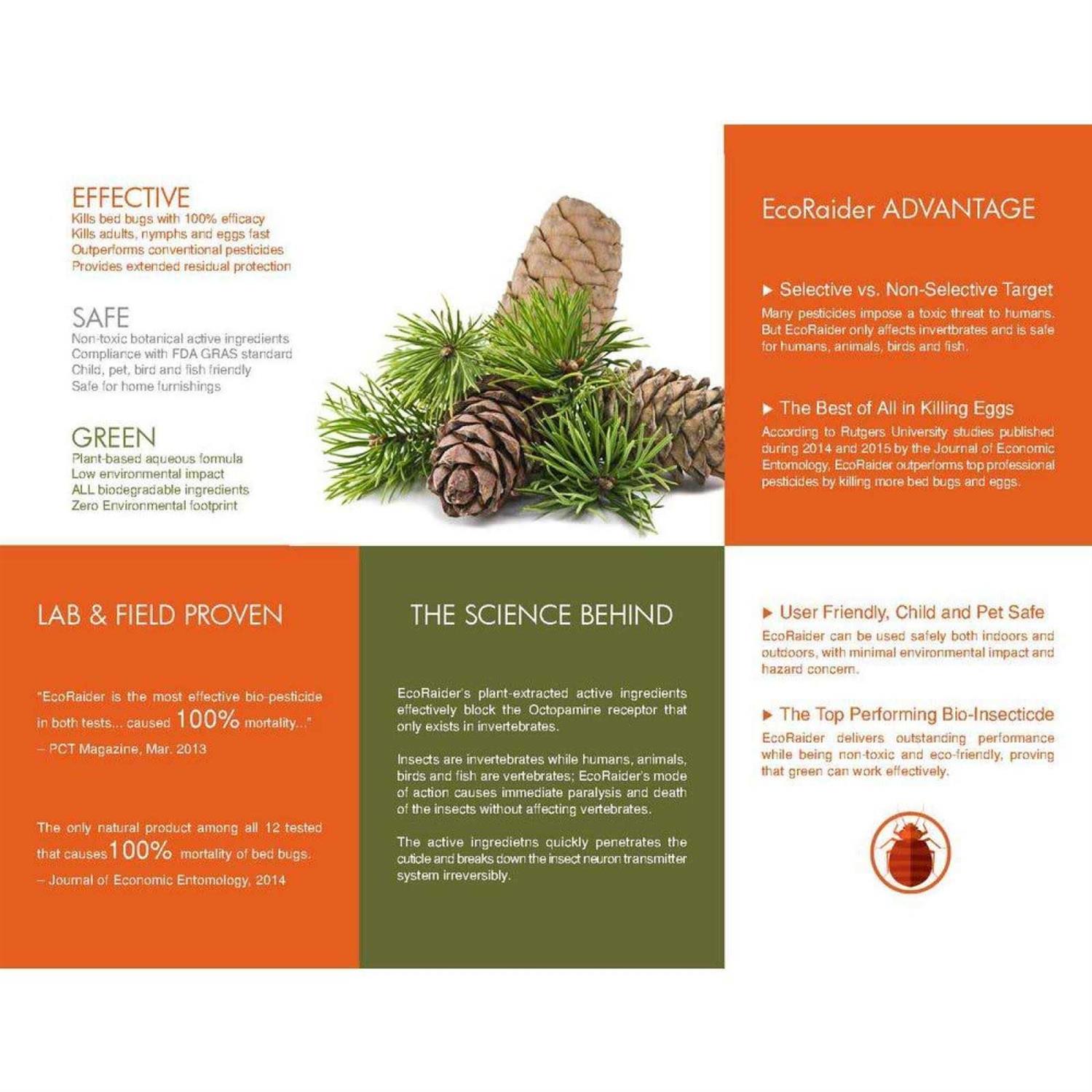EcoRaider is named the “#1 Effective Bio-Insecticide against Bed Bugs” in a study published by the Entomological Society of America. Among 12 bed bug products including natural, synthetic and professional brands, EcoRaider was shown to have the highest efficacy in killing bed bug adults and eggs. Due to repeat use of pesticides over the years, bed bugs developed high resistance. EcoRaider, however, has a unique mode of action to cause quick mortality of resistant bed bugs. As a green product, EcoRaider acts surprisingly fast. Its micro-scale particles of active ingredients penetrate exoskeleton and attack a unique neuron receptor that only exists in invertebrates to cause immediate paralysis and death. Unlike many pesticides imposing neuron toxicity to human, EcoRaider’s mode of action only affects insects and causes no harm to human, pet, bird or fish. EcoRaider provides residual efficacy for up to two weeks. Its 14-day dry residual has been shown to cause 97.5% mortality to bed bugs. Because of its outstanding performance, EcoRaider has become a preferred choice by pest management professionals as a primary method of IPM (Integrated Pest Management) to reduce the use of synthetic chemicals. EcoRaider is categorized by EPA as a minimum risk pest control product and safe to use around children and pets.