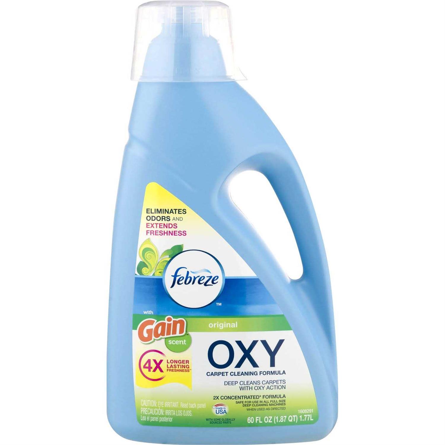 Clean your carpets with the fresh scent of Gain! Febreze With Gain Scent eliminates odors and extends freshness. Plus, it contains oxy to start working on contact to mobilize, lift, and penetrate stains at the source. Febreze With Gain maximizes the performance of all leading upright deep-cleaning machines, including rentals. The earth-friendly formula is free of dyes, phosphates, and heavy metals.