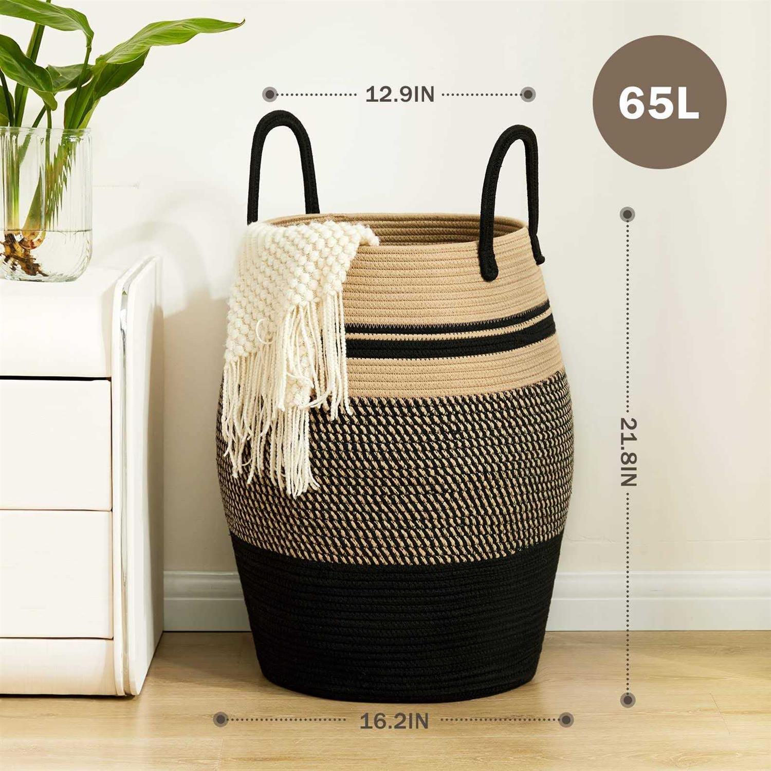100% cotton 【Eco-friendly Extra Large Hamper】The overall size of the laundry hamper is approximately 16.5D x 21.6H inches which is 100% natural hand woven cotton thread rope has no plastics, harsh chemicals, toxins, or harmful additives. Perfect for clothes, blanket, throws and stuffed animals 【Large and Portable Hamper】 The maximum capacity of the dirty clothes hamper is 65L which is 12% larger than other basket. It can store a week’s clothes, save more time to enjoy life. The double stiching handle is sturdy enough to hold at least 44 lbs weights. The long design handle makes it much easier tote to anywhere you want 【Durable Laundry Basket】The cute and modern hamper provide a nice fine Nordic touch to any room of the house. The tall basket is very suitable for any place of your home and decor your room in the meantime. You can put it in living room, bedroom, laundromat, baby room or dorm room. It’s easy to fold up and store to save space when you not use. You can stuff it full with a lots of clothes or blankets to give it a little time to regain its shape. If you have an iron to iron out the crease, can speed up its recovery.