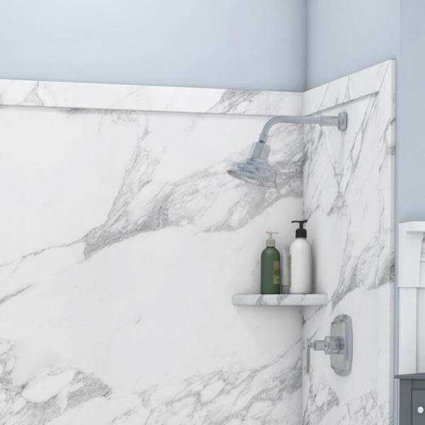 Expand your storage space for soap, shampoo and other bath needs with an extra FlexStone corner shelf. Each shelf comes with an easy-install metal bracket and a clamshell-style FlexStone wrap. Perfectly complements FlexStone wall surround colors High-definition imagery looks just like real stone Composite polyvinyl shelf is lightweight and easy to install Add extra storage space to your bath or shower surround Clamshell-shaped shelf adheres over bracket with adhesive Easy add-on for any FlexStone bath or shower surround kit Metal bracket included for easy installation and added support Made from composite polyvinyl, the same material used to make FlexStone wall panels Brighten and highlight your wall space with this FlexStone Corner Shelf Niche in Calacatta White.