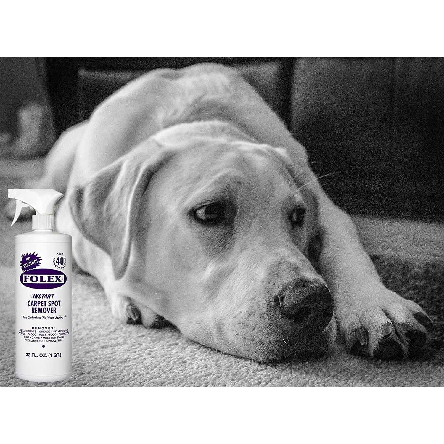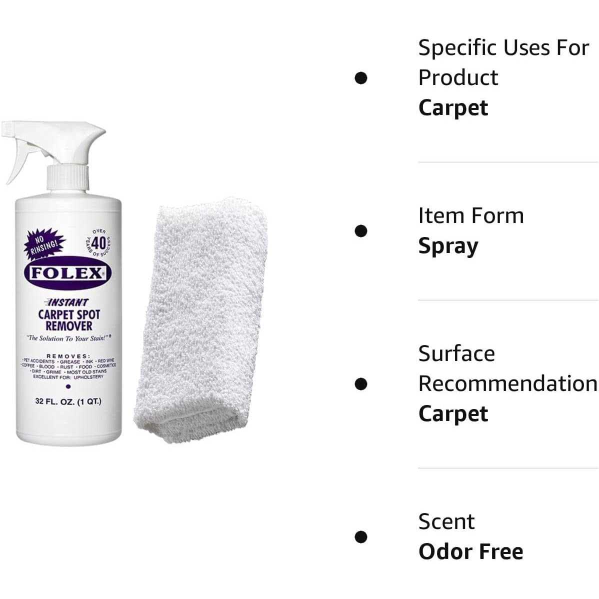 - Includes 32oz FOLEX Instant Carpet Spot Remover Spray Bottle + Daley Mint Cloth