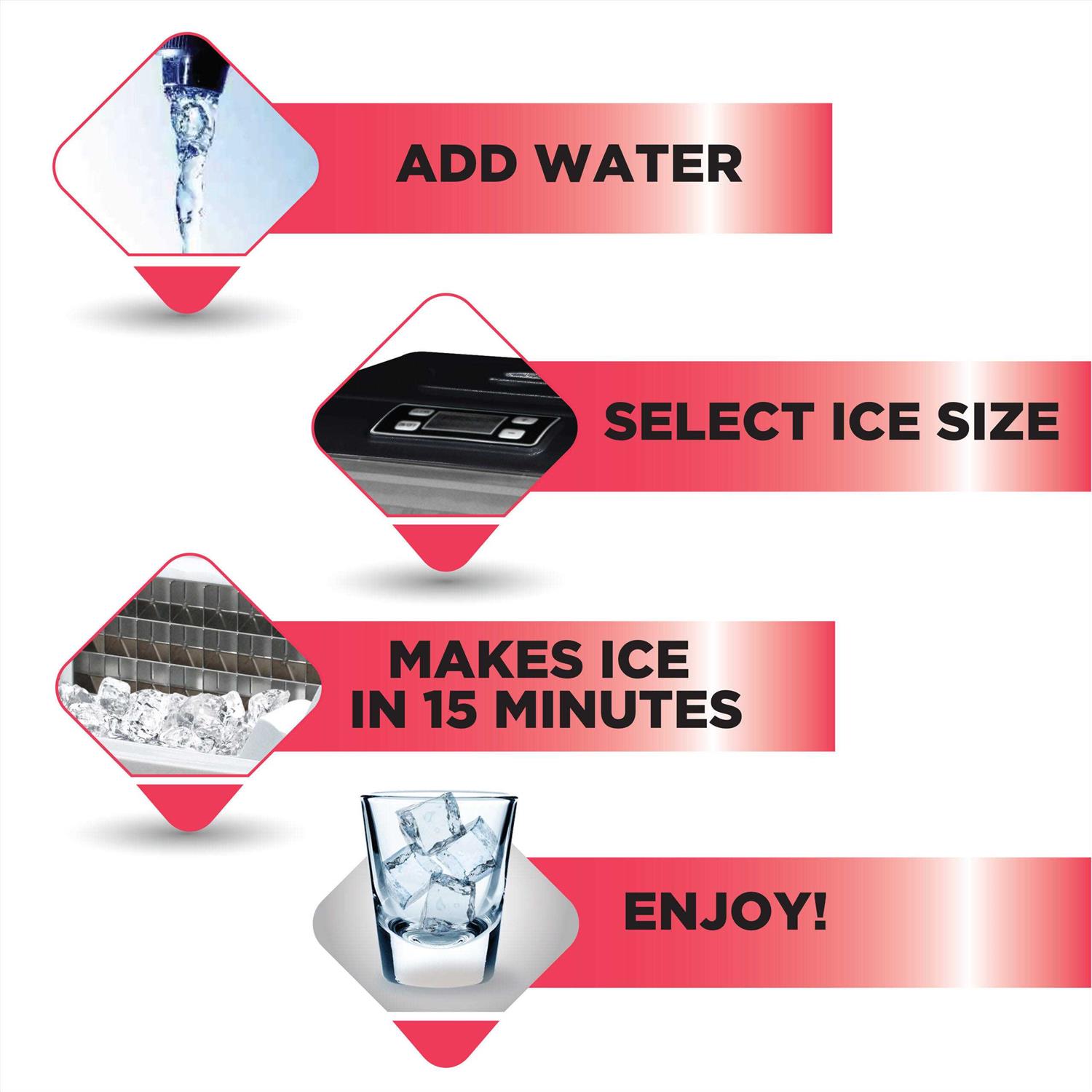 - Electric ice maker is designed to be quiet; Runs on 120 watts with a silent cooling function EASY TO USE