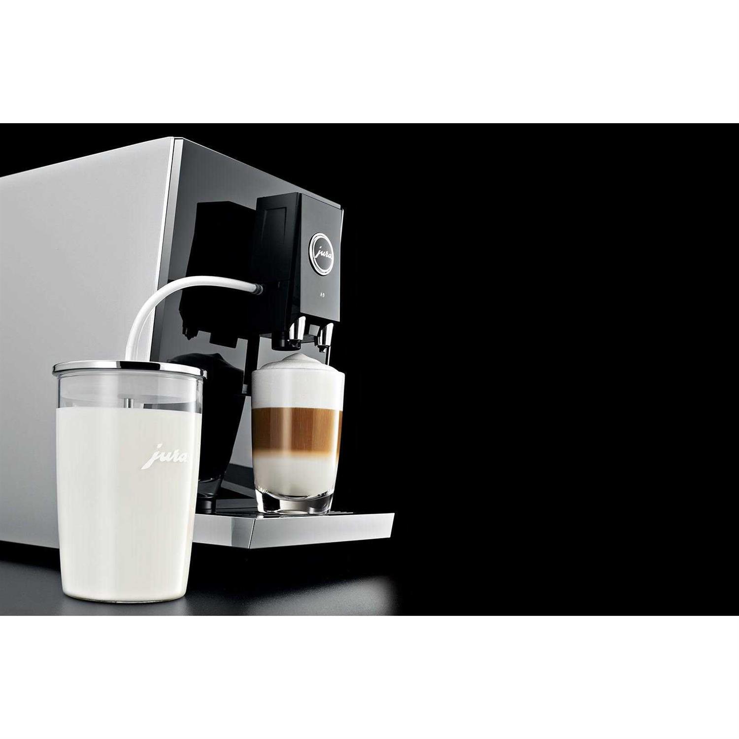 Beautifully practical The glass milk container makes an indispensable addition for all coffee lovers who like to spoil their family and guests from time to time with a trendy flat white, latte macchiato or cappuccino. Perfectly harmonised with the typical lines of JURA design, it is easy to store in the refrigerator and connect up to the coffee machine as and when required. The milk lance is connected at just the right height to allow the milk to be drawn in and frothed with ease. The container holds 0.5 litres and is dishwasher-safe. Features The quick and easy way to enjoy the perfect cup of coffee The milk pipe is connected to the cover and preparation can be started. The simple plug connections ensure that the route the milk follows is totally clean. The outer area of the milk pipe, which is often dirty, never comes into direct contact with the milk. High-quality, perfectly hygienic materials The high-quality glass container and the stainless steel milk lance are ideal for storing milk as they are taste-neutral. Easy to store The glass milk container is very manageable and can be easily stored in the refrigerator door. Easy to clean Since they have a smooth surface and are suitable for dishwashers, glass and stainless steel are nice and easy to clean.