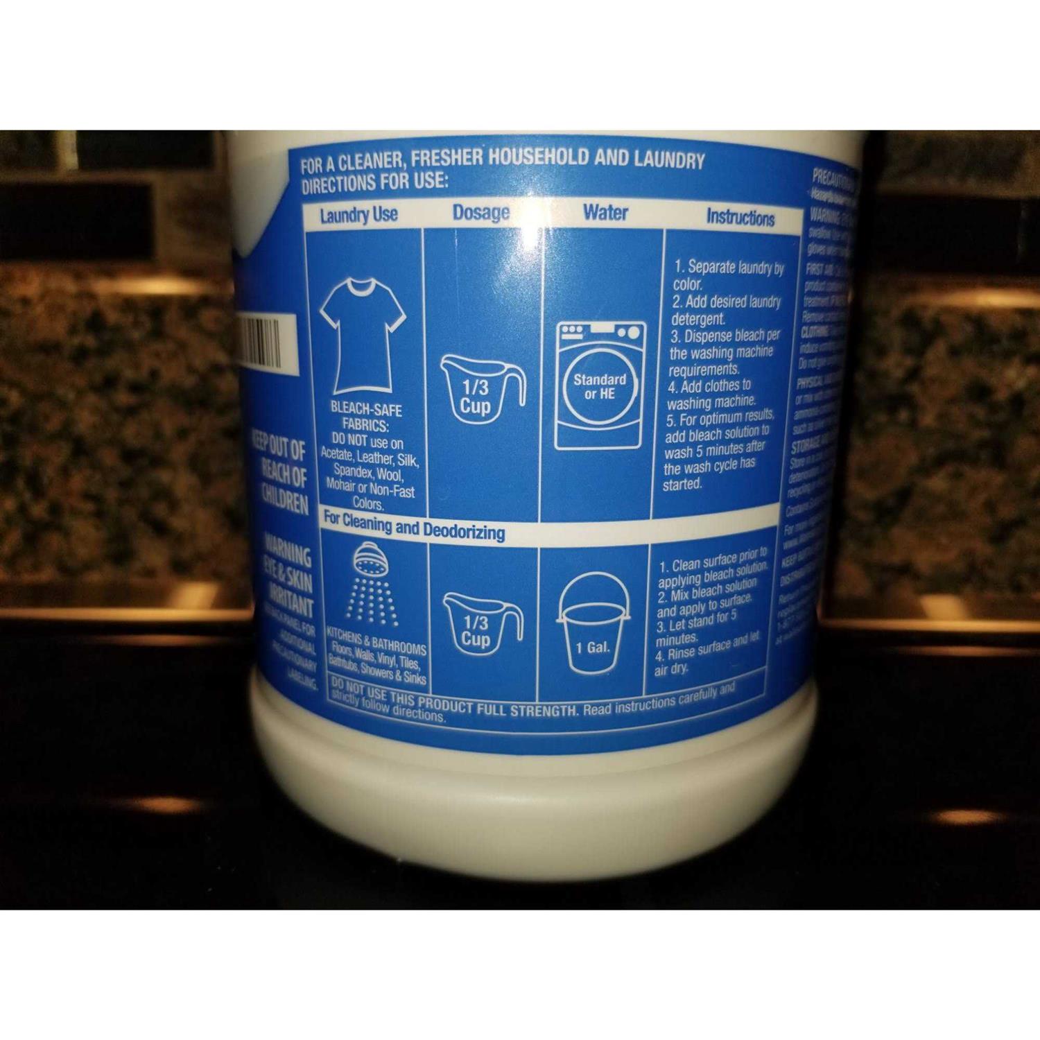Great Value Easy Pour Bleach is great for a cleaner, fresher household and laundry. It is designed to work with most standard HE washers and will keep your whites bright as it fights tough to remove stains. It is also effective for cleaning common household surfaces such as bathrooms, kitchen surfaces, dishes and sinks. This bleach is also effective in cleaning and deodorizing pre-cleaned toilet bowls. Clean away the messes and keep your home clean and deodorized with Great Value Easy Pour Bleach.