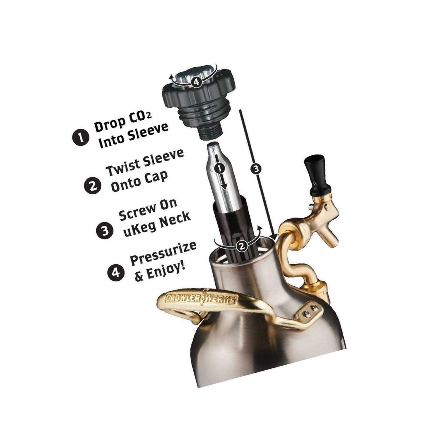 Take the look of your favorite brewery with you Like your favorite vintage downtown brewery, the Growlerwerks uKeg 64 Stainless Steelbeer growler brings a modern and sleek brewery look. This pressurized half-gallon growler helps keep beer cold and fresh. Whether at the home bar or tailgate bar, this durable, double-walled vacuum insulated stainless steel growler features a CO2 regulator cap with customizable tap handle and gauge. Includes two CO2 cartridges. Set Includes: Double-walled, stainless steel growler, vacuum-insulated to keep your beer cool for up to nine hours. Adjustable pressurization cap to keep oxygen out and carbonation at an ideal level using small CO2 cartridges (two included). Steampunk-inspired tap assembly with pressure and level gauges to keep an eye on your beloved beer. Gooseneck tap that swings sideways for compact transportation. Tap handle that can be swapped for one from your favorite brewery. Illustrated manual including ideal pressure settings for different varieties of beer, instructions for force carbonating homebrew, and two tempting cocktail recipes.