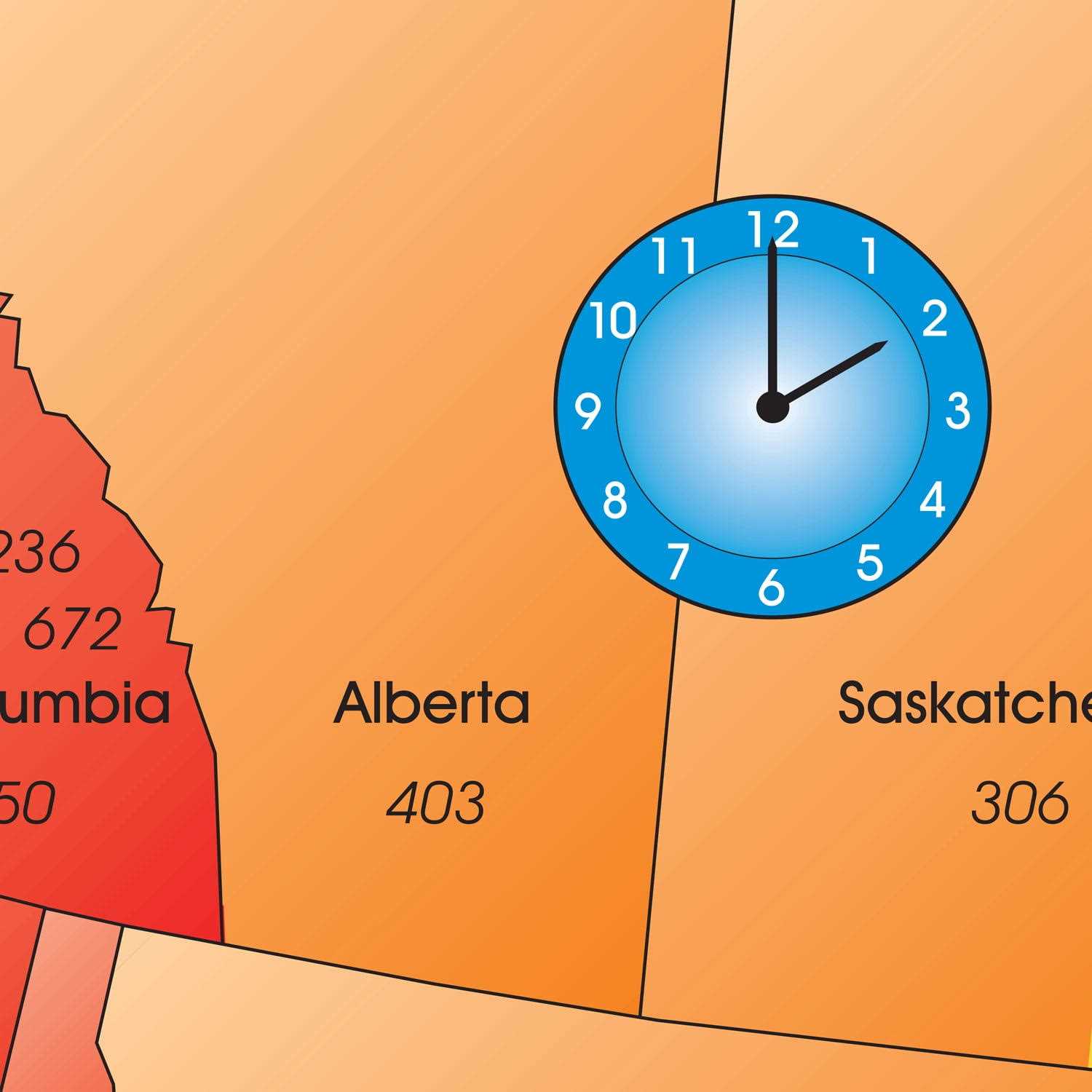 Full color large wall map features North American time zones. Colored zones make finding Pacific, Mountain, Central, Eastern, and Atlantic time zones quick an easy. Sharp, clear details include state borders, abbreviations, and all area code boundaries. Map is updated annually to include new area codes. Reverse lookup table lists all United States area codes in numerical order; know where your call is coming from and what time it will be when you return the call. Artistic map style and design within borders gives map a 3D look. Printed clocks show example times for each colored zone; hands do not move on clocks. Wall map printed on satin photo paper in full 24.5 by 35 inch size, with 0.25 inch white border. Unlaminated finish reduces glare.