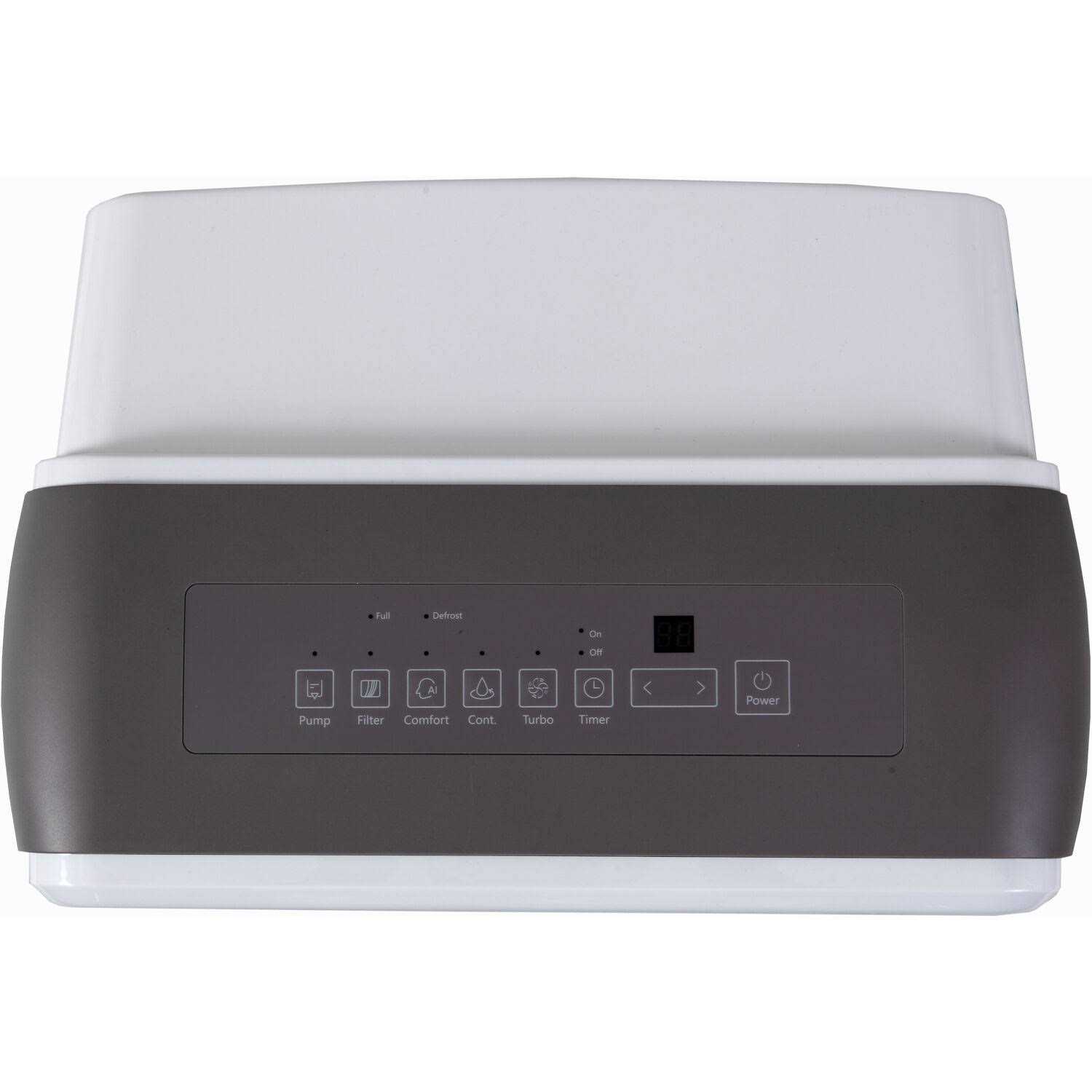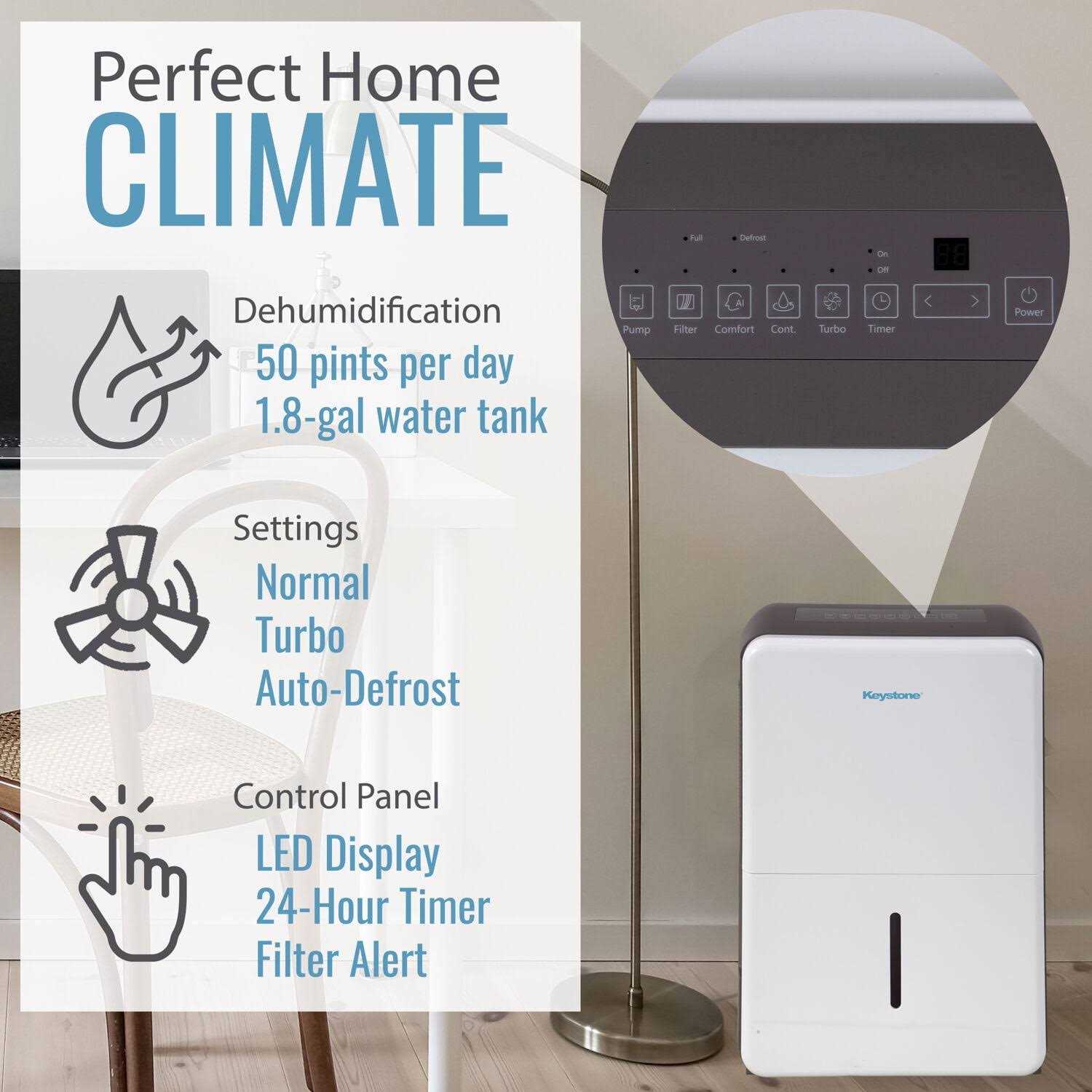 Keystone 50-Pint Dehumidifier w/ Electronic Controls and Built-In Pump The Keystone 50-pint dehumidifier features a built-in worry-free pump that allows the unit to continuously discharge water upward to drain out a basement window or into a sink removing up to 50 pints of moisture from the air per day in a room up to 4500 square feet. Features include electronic controls with LED display, a 24-hour timer, a transparent water level indicator, and a full bucket alert with automatic shutoff. It also has a removable, easy-cleaning dust filter with a clean-filter alert. The auto-restart saves your settings during a power outage and the omni-directional caster wheels make the unit easy to move to another location.