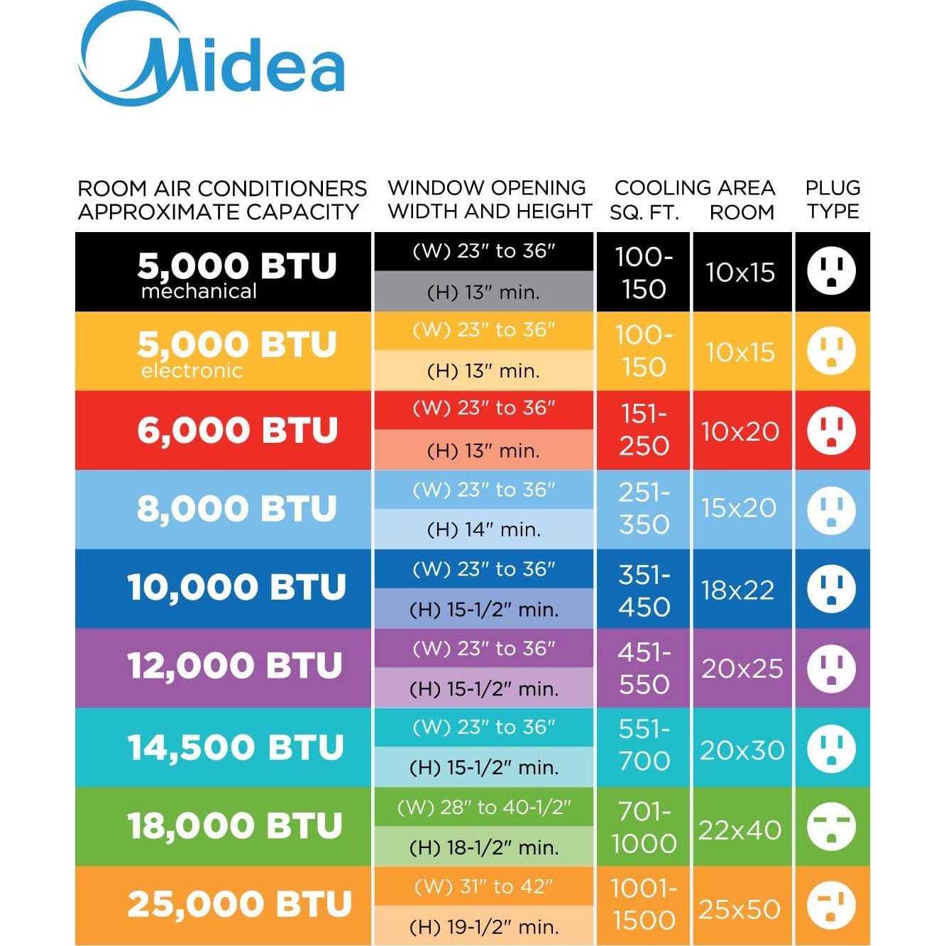 Stay comfortable all summer long with the Midea 5,000 BTU Window Air Conditioner with ComfortSense Remote Control. Mideas new ComfortSense remote adjusts the cooling strength based on the location of the remote! With three different cooling settings and three different fan speeds – there is no doubt you will find the setting that provides you with optimal comfort. You can select high, medium, or low – or use the energy saver button, designed to help you lower your energy bill. With the 24-hour timer you could set the timer, so your air conditioner turns on an hour before you get home! The Midea 5,000 BTU Window Air Conditioner with ComfortSense Remote is ideal for cooling smaller spaces up to 150square feet. The Midea 5,000 BTU Window Air Conditioner with ComfortSense Remote also comes with a clean filter indicator button that lights up when it is time to remove and clean it. The Midea 5,000 BTU Window Air Conditioner with ComfortSense Remote is designed to fit windows 23-26 wide, and minimum height of 13.