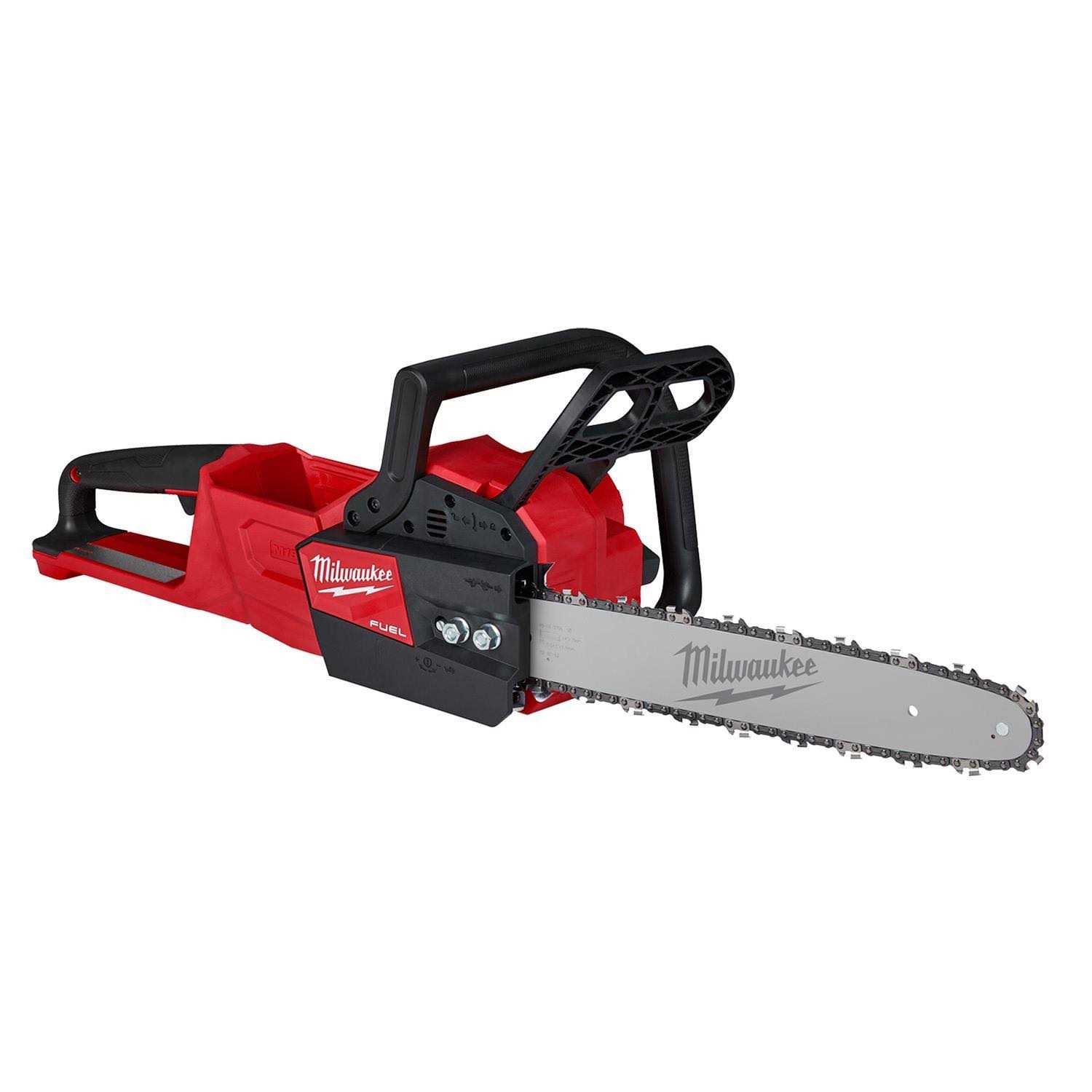 Milwaukee 2727-20C 14 inch 18V Chainsaw Chainsaw is designed with a 14 inch Oregon bar and chain. Provides variable speed trigger, dual-stud, automatic oiler and onboard storage. Delivers up to 150 cuts per charge and can quickly cut hardwoods. Protects against overload, overheating and over discharge. Reaches full throttle in under 1 second.