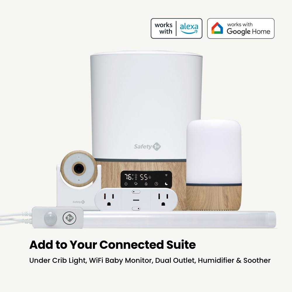 Feel confident that your childs room always has the ideal humidity level and help keep their throat and nasal passages hydrated with the Safety 1st Smart Humidifier. Top-fill tank with one gallon (3.8L) capacity can run uninterrupted for up to 24 hours. Touch display with humidity and temperature indicator allows you to monitor room temperature and humidity level. This humidifier uses the Safety 1st Connected App which is the only app that empowers parents to create the optimal environment, set the mood, monitor, and comfort their childanytime, from anywhere. This easy-to-use, family friendly app seamlessly controls and manages every device in the Connected Suite giving parents the confidence and peace of mind they need to stay connected to their child even when theyre apart. Safety 1st believes parenting should have fewer worries and more joyful moments. As the first and only leader in child safety, Safety 1st is here to give you peace of mind so you can spend less time worrying and more time enjoying every first you experience with your child.