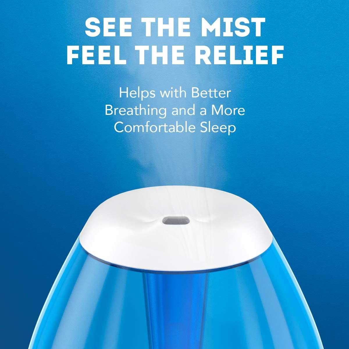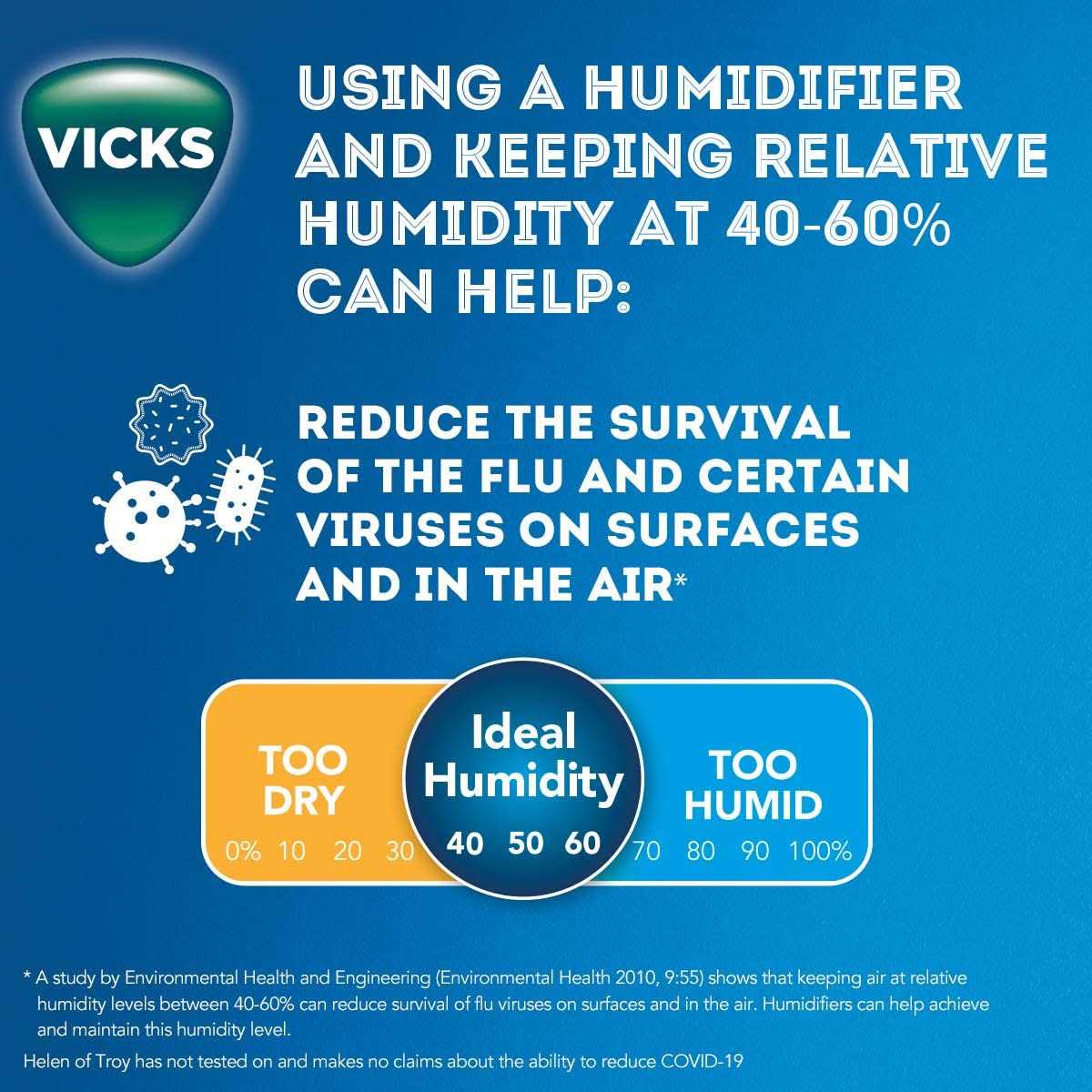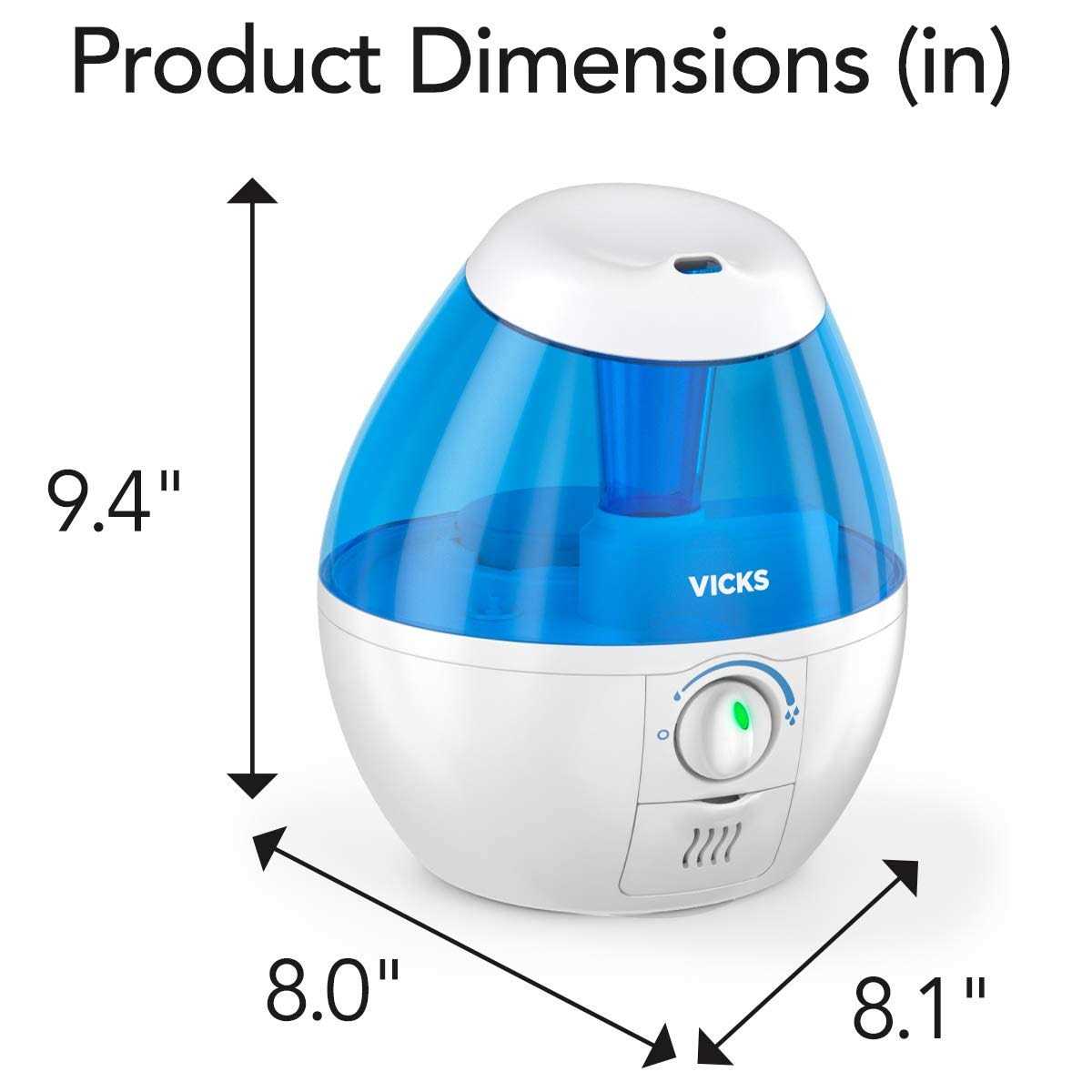 The Mini Filter Free cool Mist Humidifier creates cool, visible mist to help temporarily relieve cough and congestion symptoms for better breathing and more comfortable sleep. Designed for small rooms, this 0.5-gallon personal humidifier has adjustable mist control to regulate the humidity level. The air humidifier can operate for up to 20 hours on the lowest setting, and it automatically shuts off when the tank is empty. The transparent tank has a wide opening that makes it easy to fill, use, and clean. This Vicks cool Mist Humidifier utilizes ultrasonic technology for whisper-quiet operation that wont disturb sleep, and it has a built-in soft glow nightlight. The Vicks Mini Filter Free cool Mist Humidifier requires no filters and works with Vicks VapoPads, so you can add soothing menthol vapors for added comfort. A sample Vicks VapoPad is included.